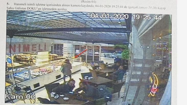 Hanımeli isimli işletme içerisinden alınan kamera kaydında; 04.01.2020 saat 19:25:44’te kayıp şahıs Gülistan Doku’nun iş yerinden ayrılışı.