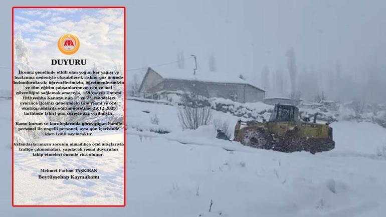 Beytüşşebap Kaymakamlığı, kar yağışı sebebiyle eğitime 1 gün ara verildiğini duyurdu. Duyuruda şu ifadelere yer verildi: