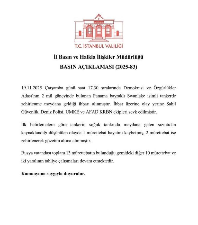 Konuyla ilgili İstanbul Valiliği tarafından yapılan açıklamada, “19.11.2025 Çarşamba günü saat 17.30 sıralarında Demokrasi ve Özgürlükler Adası’nın 2 mil güneyinde bulunan Panama bayraklı Swanlake isimli tankerde zehirlenme meydana geldiği ihbarı alınmıştır. İhbar üzerine olay yerine Sahil Güvenlik, Deniz Polisi, UMKE ve AFAD KRBN ekipleri sevk edilmiştir. İlk belirlemelere göre tankerin soğuk tankında meydana gelen sızıntıdan kaynaklandığı düşünülen olayda 1 mürettebat hayatını kaybetmiş, 2 mürettebat ise zehirlenerek gözetim altına alınmıştır. Rusya vatandaşı toplam 13 mürettebatın bulunduğu gemideki diğer 10 mürettebat ve iki yaralının tahliye çalışmaları devam etmektedir” ifadeleri kullanıldı.