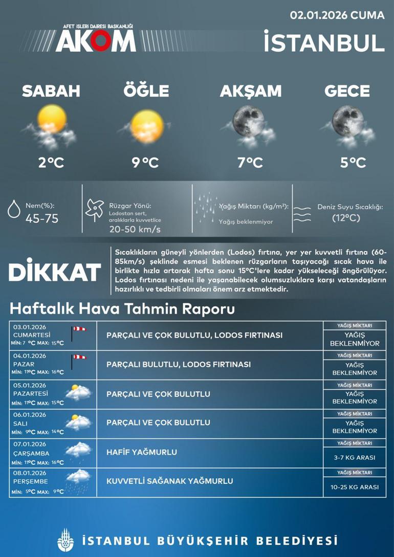 AKOM’un 2 Ocak tarihli raporuna göre İstanbul’da hava, önümüzdeki günlerde alışılmışın dışında bir seyir izleyecek. Bugün sabah saatlerinde sıcaklık 2 dereceye kadar düşerken, gün içinde parçalı bulutlu hava hakim oldu. Yağış beklenmezken rüzgar lodos yönünden etkisini artırmaya başladı.