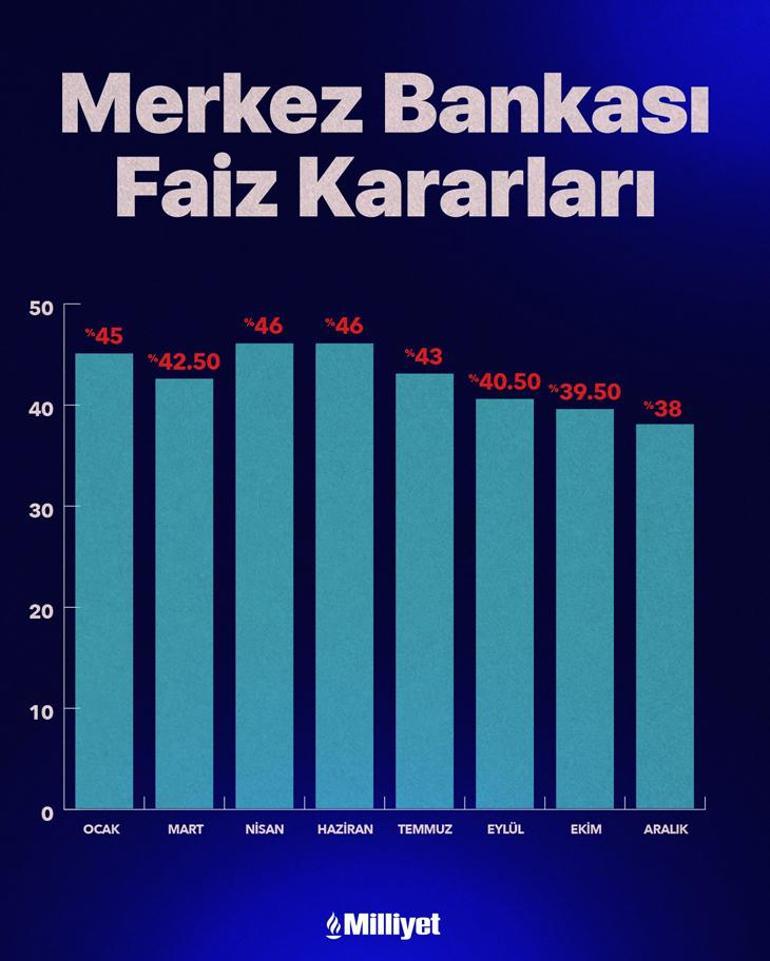 Merkez Bankası tarafından yapılan açıklamada şu ifadelere yer verildi: Para Politikası Kurulu (Kurul), politika faizi olan bir hafta vadeli repo ihale faiz oranının yüzde 39,5’ten yüzde 38’e indirilmesine karar vermiştir. Kurul ayrıca, Merkez Bankası gecelik vadede borç verme faiz oranını yüzde 42,5’ten yüzde 41’e, gecelik vadede borçlanma faiz oranını ise yüzde 38’den yüzde 36,5’e indirmiştir.
