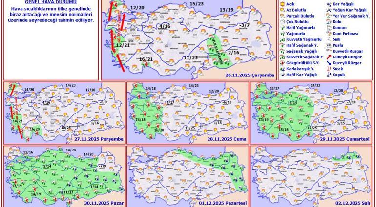 Meteoroloji Genel Müdürlüğü tarafından yapılan tahminlere göre: Ülkemiz genelinin parçalı, yer yer çok bulutlu, Orta ve Doğu Akdeniz, Güneydoğu Anadolu’nun batısı ile Antalya, Karaman, Aksaray, Niğde, Nevşehir, Kayseri, Sivas, Samsun, Amasya, Tokat, Malatya, Tunceli ve Elazığ çevrelerinin sağanak ve yer yer gök gürültülü sağanak yağışlı geçeceği tahmin ediliyor. Sabah ve gece saatlerinde Marmara’nın doğusu ile iç ve doğu kesimlerde pus ve yer yer sis olayı bekleniyor.