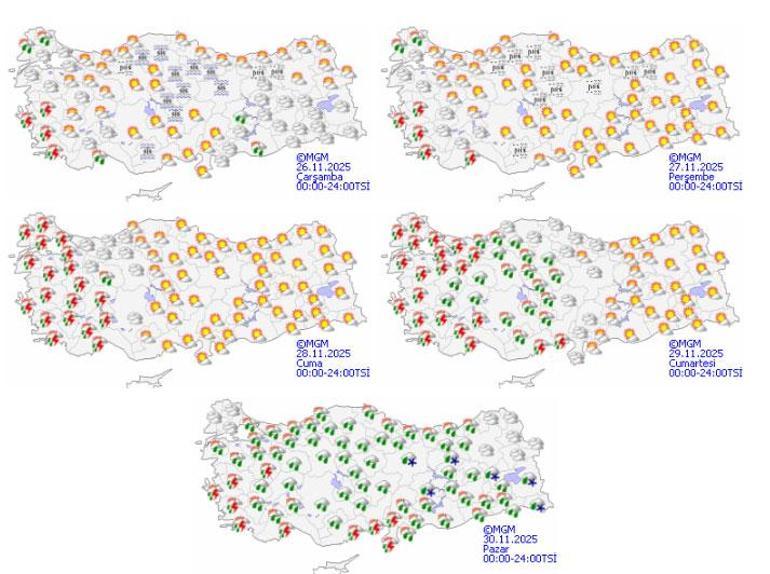Meteoroloji çarşamba günü Doğu Anadolu bölgesi için kar yağışı uyarısında bulundu. Ağrı ve Erzurum gibi illerde sıcaklıklar gece -3 dereceye kadar düşecek. Aynı zamanda Doğu Karadeniz’de de yer yer sağanak yağışlar bekleniyor. Perşembe günü ise batı bölgelerde havanın parçalı bulutlu ve yer yer hafif yağmurlu olması beklenirken, Doğu Anadolu’nun kuzeydoğusunda hafif kar yağışı etkili olmaya devam edecek. Cuma günü ise Doğu ve Güneydoğu Anadolu bölgelerinde gök gürültülü sağanak yağmur, batı ve iç kesimlerde ise bulutlu hava hakim olacak.