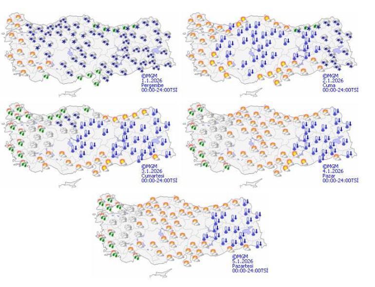 Meteoroloji tarafından yapılan tahminlere göre: Ülkemiz genelinin parçalı ve çok bulutlu, Marmara’nın doğusu, Orta ve Doğu Akdeniz, İç Anadolu, Karadeniz, Doğu ve Güneydoğu Anadolu ile Denizli, Kütahya, Afyonkarahisar ve Isparta çevrelerinin aralıklı yağışlı geçeceği tahmin ediliyor. Akdeniz kıyılarında yağmur ve sağanak, diğer yerlerde karla karışık yağmur ve kar şeklinde görülecek yağışların; Doğu Karadeniz kıyıları, Doğu Anadolu’nun güneydoğusu ile Sakarya, Düzce, Zonguldak, Bartın, Ordu, Gümüşhane, Erzincan, Tunceli, Bingöl, Muş, Batman ve Siirt çevrelerinde kuvvetli ve yoğun kar şeklinde olması bekleniyor. İç ve doğu kesimlerinde buzlanma ve don olayı bekleniyor. Doğu Karadeniz’in yüksekleri ile Doğu Anadolu’nun doğusunun yükseklerinin, yüksek kar örtüsüne sahip eğimli kesimlerinde çığ tehlikesi bulunmaktadır.