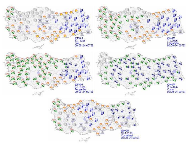 Meteoroloji Genel Müdürlüğü tarafından yapılan tahminlere göre: Ülkemiz genelinin parçalı ve çok bulutlu, Kıyı Ege ile Balıkesir’in batı ilçeleri, Çanakkale, Tekirdağ, Edirne ve Kırklareli çevrelerinin yağmur ve sağanak yağışlı geçeceği tahmin ediliyor. Rüzgarın; Marmara’nın batısı ve Kıyı Ege’de güney ve güneybatı yönlerden kuvvetli (40-60 km/saat); Hatay’ın güneyinde, kuzey ve doğu yönlerden kuvvetli ve kısa süreli fırtına (40-70 km/saat) şeklinde esmesi bekleniyor. Sabah ve gece saatlerinde iç ve doğu bölgelerde buzlanma ve don ile birlikte pus ve yer yer sis olayı bekleniyor. Doğu Karadeniz’in iç kesimlerinin yüksekleri ile Doğu Anadolu’nun doğusunda yüksek kar örtüsüne sahip eğimli kesimlerinde çığ tehlikesi bulunmaktadır.