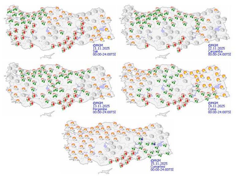Meteoroloji Genel Müdürlüğü tarafından yapılan tahminlere göre: Ülkemizin kuzey ve batı kesimlerinin parçalı, yer yer çok bulutlu, Edirne, Tekirdağ, Kırklareli, Çanakkale ve İzmir çevreleri ile Aydın’ın kıyı kesimlerinin sağanak ve gök gürültülü sağanak yağışlı, diğer yerlerin az bulutlu ve açık geçeceği tahmin ediliyor.