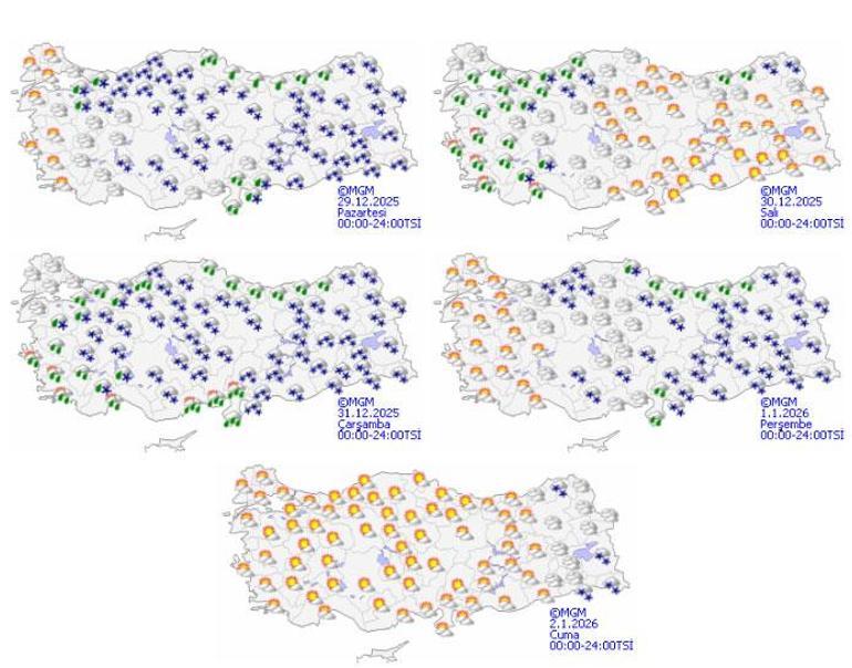 Meteoroloji Genel Müdürlüğü tarafından yapılan tahminlere göre: Ülkemiz genelinin parçalı ve çok bulutlu, Marmara ve Doğu Akdeniz’in doğusu, İç Anadolu’nun kuzey ve doğusu ile Karadeniz, Doğu ve Güneydoğu Anadolu Bölgelerinin yağışlı geçeceği tahmin ediliyor. Orta Karadeniz kıyıları ile İskenderun Körfezi çevrelerinde yağmur, diğer yerlerde karla karışık yağmur ve kar şeklinde görülecek yağışların, Batı Karadeniz, Güneydoğu Anadolu’nun doğu, Doğu Anadolu’nun güneydoğu kesimleri ile Sakarya çevrelerinde kuvvetli olması bekleniyor. Kuzey, iç ve doğu kesimlerde buzlanma ve don ile birlikte pus, yer yer sis görüleceği tahmin ediliyor.
