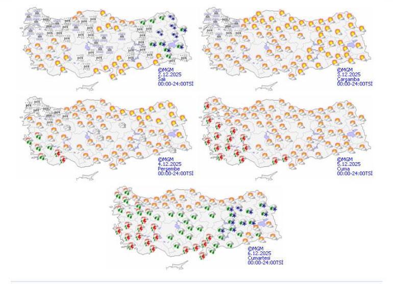 Meteoroloji Genel Müdürlüğü tarafından yapılan tahminlere göre: Ülkemiz genelinin parçalı ve çok bulutlu, Marmara’nın doğusu, Kuzey Ege, İç Anadolu (Karaman ve Niğde hariç), Karadeniz, Doğu Anadolu, Kahramanmaraş, Osmaniye, Hatay ve Siirt çevreleri ile Adana’nın doğu, Aydın’ın kıyı kesimlerinin yağışlı geçeceği tahmin ediliyor. Yağışların genellikle yağmur ve sağanak, İç Anadolu’nun kuzeydoğusu, Batı ve Doğu Karadeniz’in iç kesimlerinin yüksekleri, Doğu Anadolu’nun kuzey ve doğusunda karla karışık yağmur ve yükseklerinde kar şeklinde olması bekleniyor. Yağışların Trabzon, Rize ve Artvin çevrelerinde yer yer kuvvetli olacağı tahmin ediliyor. Sabah ve gece saatlerinde iç kesimlerde pus ve yer yer sis, İç Anadolu’nun kuzeydoğusu ile Doğu Anadolu’nun kuzeyinde buzlanma ve don olayı bekleniyor.