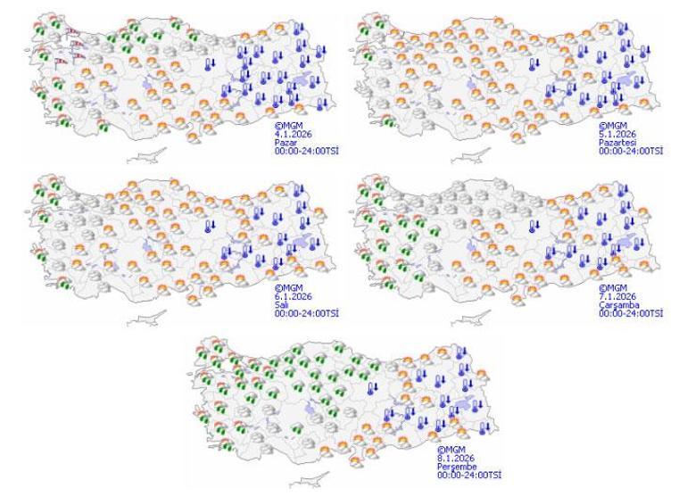 Meteoroloji Genel Müdürlüğü tarafından yapılan tahminlere göre: Ülkemizin kuzey ve batı kesimlerinin yer yer çok bulutlu, Marmara’nın batısı, Ege’nin kıyı kesimleri, Antalya, Samsun ve Sinop çevrelerinin yağışlı, diğer yerlerin parçalı ve az bulutlu geçeceği tahmin ediliyor. Yağışların; genellikle yağmur ve sağanak, Sinop ve Samsun’un iç ve yüksek kesimlerde karla karışık yağmur ve yer yer kar şeklinde olması bekleniyor. Sabah ve gece saatlerinde iç ve doğu kesimlerde buzlanma ve don ile birlikte pus ve yer yer sis bekleniyor. Doğu Karadeniz’in yüksekleri ile Doğu Anadolu’nun doğusunun yükseklerinin yüksek kar örtüsüne sahip eğimli kesimlerinde çığ tehlikesi bulunmaktadır.