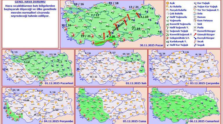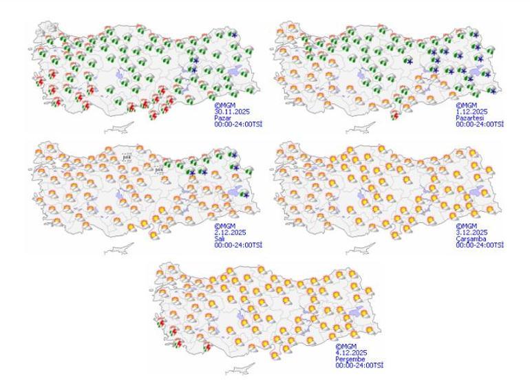 Aralık ayının ilk haftasıyla birlikte sıcaklıklar tüm yurtta düşüyor. Bu düşüş batıda mevsim normaline doğuda bir tık altına olabilir. Bu düşüş doğu Anadolu’da karla karışık yağmur ve kar yağışı yapar. Batıda yağmurlar olası. Bu yağışlar önümüzdeki hafta sonu da Ege ve Akdeniz kıyılarında şiddetli dikkat edilmeli