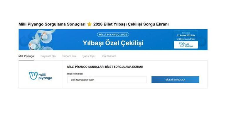 Bir yeni yıl klasiği haline gelen Milli Piyango Yılbaşı özel çekilişi için geri sayım başladı. Çekiliş 18.30’da başlayacak, 800 milyon TL değerindeki rekor büyük ikramiye ise saat 23.15’te sahibini bulacak. Büyük umutlarla bilet alan vatandaşlar, şanslı numaraların açıklanmasını bekliyor. Peki, çekiliş sonuçları nereden öğrenilir? İşte Milli Piyango 2026 yılbaşı özel çekilişine dair tüm detaylar.