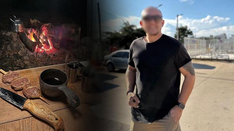 Enis G.’nin sanal medya hesabından paylaştığı fotoğrafta ise kamp ateşi, alkol şişesi ve kadehi ile bıçak ve et yer aldı.