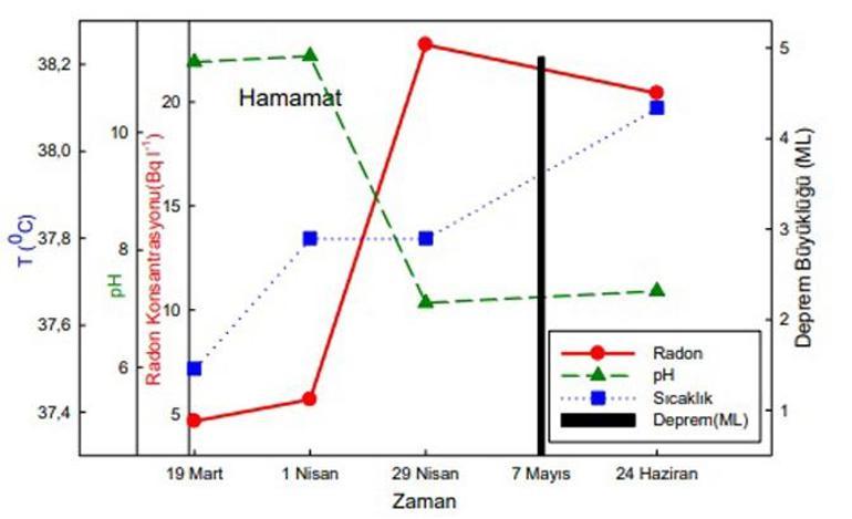 Çalışmada; iki su kaynağında gözlemlenen radon aktivitesi, ölçümler arasında yaklaşık 5 kat değiştiği gözlendi. Radon aktivitesindeki bu önemli değişikliklerin bölgedeki sismik aktivite ile ilişkili olduğu saptandı.