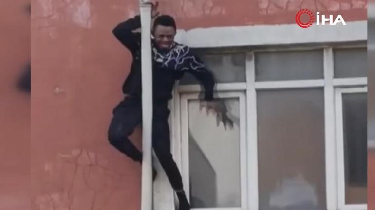 İstanbul Sultangazi’de bulunan 5. katlı binanın çatısında çıkan yangında, dairede ailesiyle birlikte yaşayan yabancı uyruklu adamın su borusuna tutunduğu sırada düştüğü anlar anlar kameraya yansıdı.