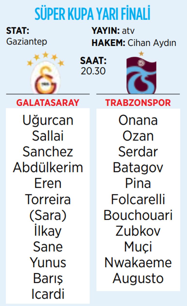 Turkcell Süper Kupa yarı finallerinin ilk maçında Galatasaray ile Trabzonspor bugün saat 20.30’da Gaziantep Stadı’nda finale kalmak için mücadele edecek. Maçı Cihan Aydın yönetecek.