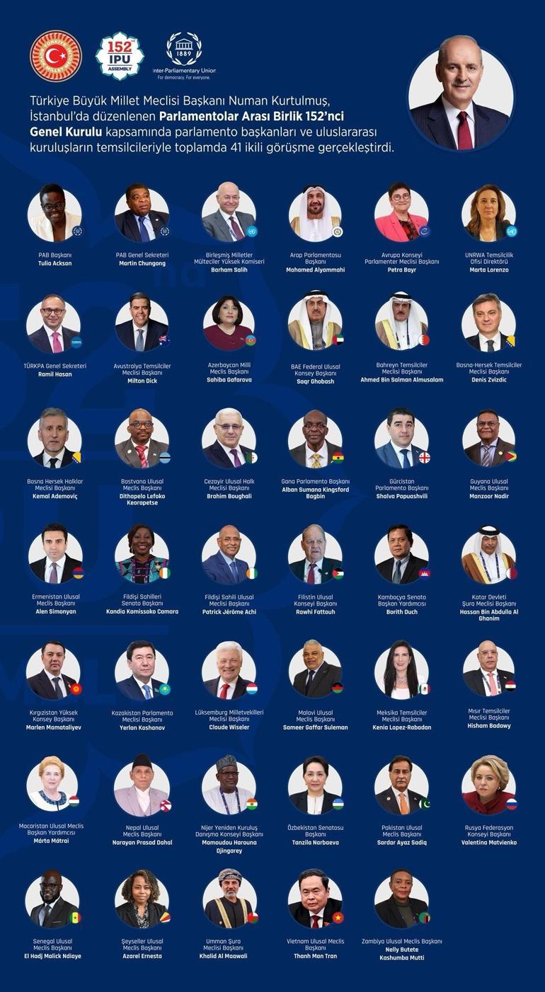 TBMM Başkanı Numan Kurtulmuş, İstanbul’da düzenlenen Parlamentolar Arası Birlik (PAB) 152. Genel Kurulu kapsamında Avrupa Konseyi Parlamenter Meclisi, Arap Parlamentosu başkanları ve bazı uluslararası kuruluşların başkanlarının da aralarında bulunduğu 41 ikili görüşme gerçekleştirdi.