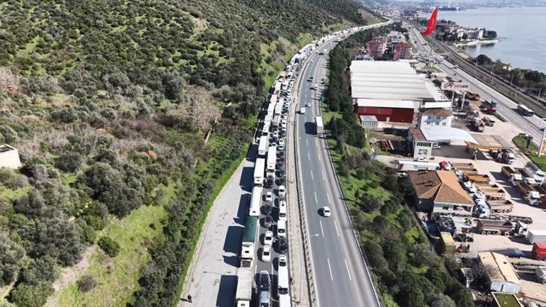 Kaza nedeniyle 3 şeritli otoyolun İstanbul yönü trafiğe kapandı. Kilometrelerce araç kuyruğu oluşu. Ekiplerin, yaklaşık 2 saattir yola saçılan malzemeleri temizleme çalışmaları sürüyor.