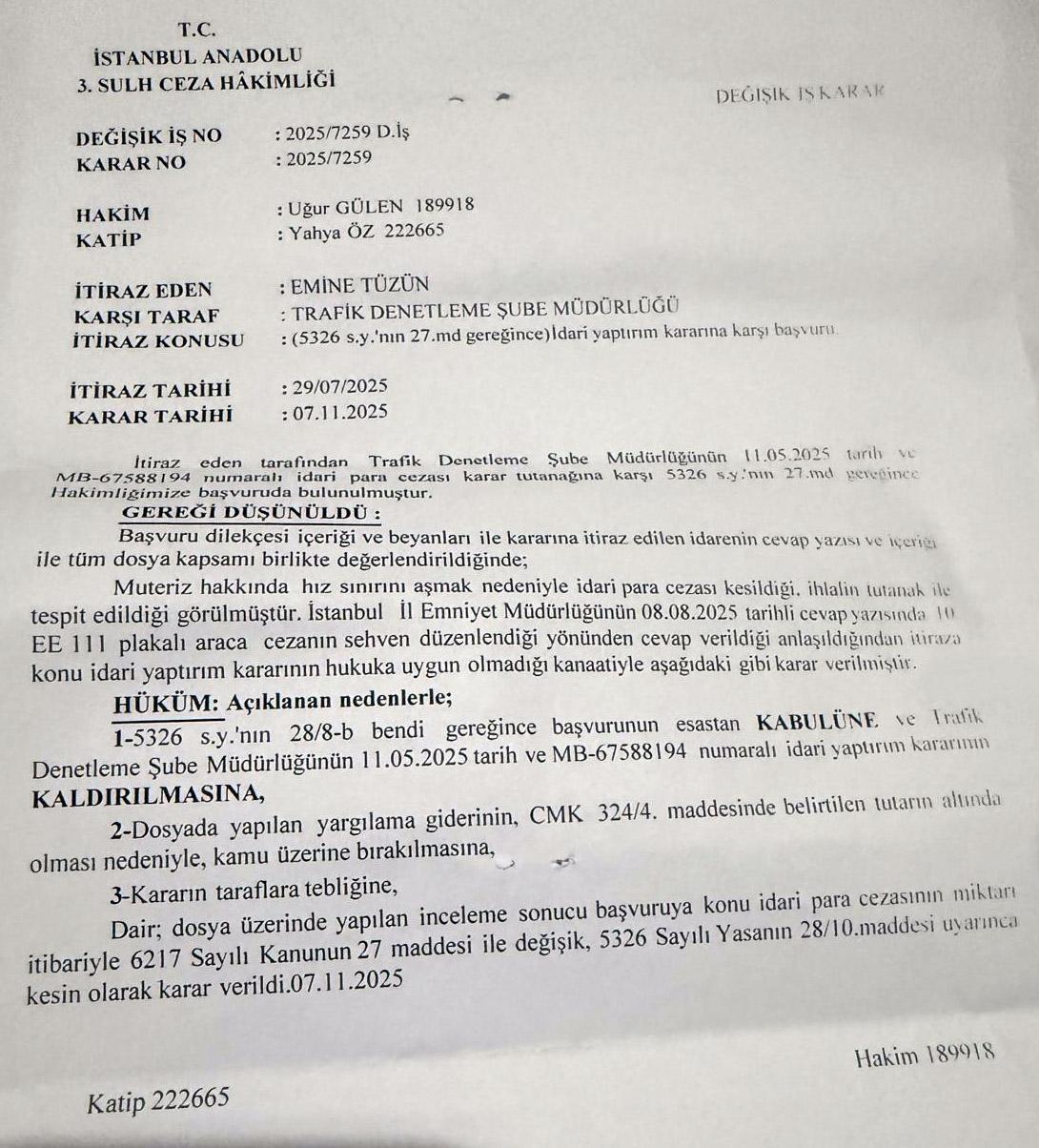 Bu cezaların tebligatı 2022 yılında yapılan Emine Tüzün, itirazları sonrası haklı bulundu ve cezalar iptal edildi. 2024 yılı Mayıs ayında İstanbul Kuzey Çevre Yolu’nda hız sınırını aştığı gerekçesiyle 690 lira ceza yazıldığına dair bir tebligat alan Emine Tüzün, buna da itiraz etti.