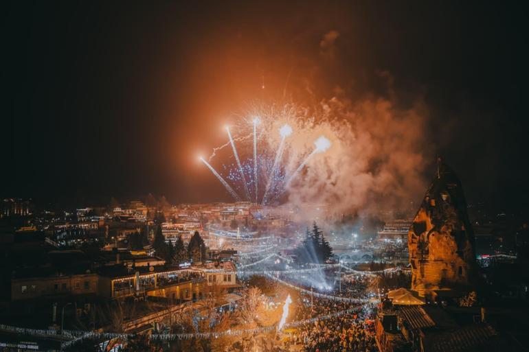Kapadokya bölgesinde yerli ve yabancı turistlerin yılbaşı kutlamaları pek çok noktaya akın etti. Kapadokya’da en fazla ilgi gösterilen mekanlar, volkanik tüfler içerisine oyularak yapılan yeraltı eğlence merkezleri oldu. Bölgeye gelen yerli ve yabancı turistler, 2026 yılını eğlence merkezlerinde karşıladı. Turistler, havai fişek ve dansöz gösterileriyle eğlendi.