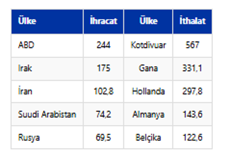 Kakaoda 2025 yıl sonu itibarıyla en fazla ihracat ve ithalat yapılan ilk 5 ülke (milyon dolar) şöyle sıralandı: