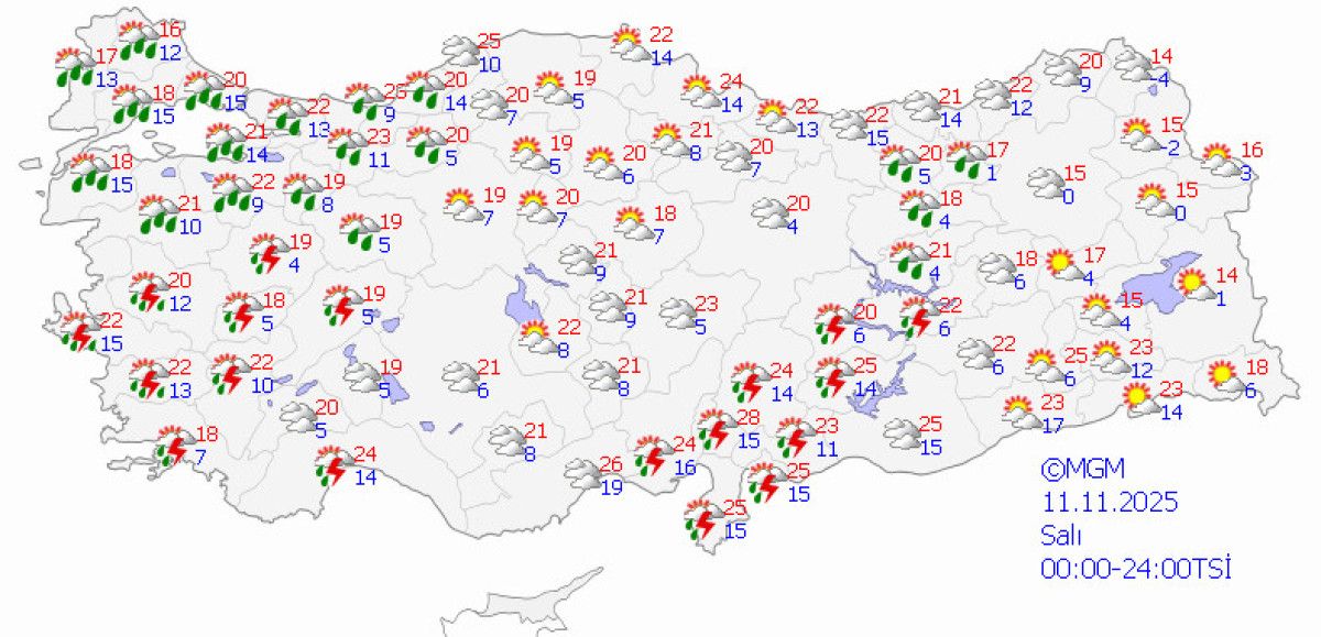11 Kasım Salı günü yağışlar yoğunlaşacak; Batı Ege ve Marmara’nın iç kesimleri gök gürültülü sağanak alacak.