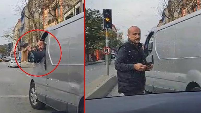 Cadde üzerindeki trafik ışıklarına gelen 34 HE 8079 plakalı hafif ticari aracın sürücüsü, otomobilin önünü kesti. Bunun üzerine otomobildeki kadın sürücü, yaşanan tartışmayı ve hafif ticari araç sürücüsünün önünü kestiği anları cep telefonu kamerasıyla kaydetti.