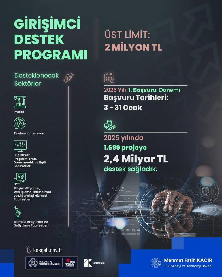 2025 yılında 1.699 proje için 2,4 milyar TL destekleme kararı aldık. 2026’da daha fazla girişimcimizi üretime, yeniliğe ve güçlü bir geleceğe taşımayı hedefliyoruz.” Bugün başlayan başvurular 31 Ocak 2026 tarihine kadar devam edecek. Detaylı bilgiye kosgeb.gov.tr adresinden ulaşılabilecek.